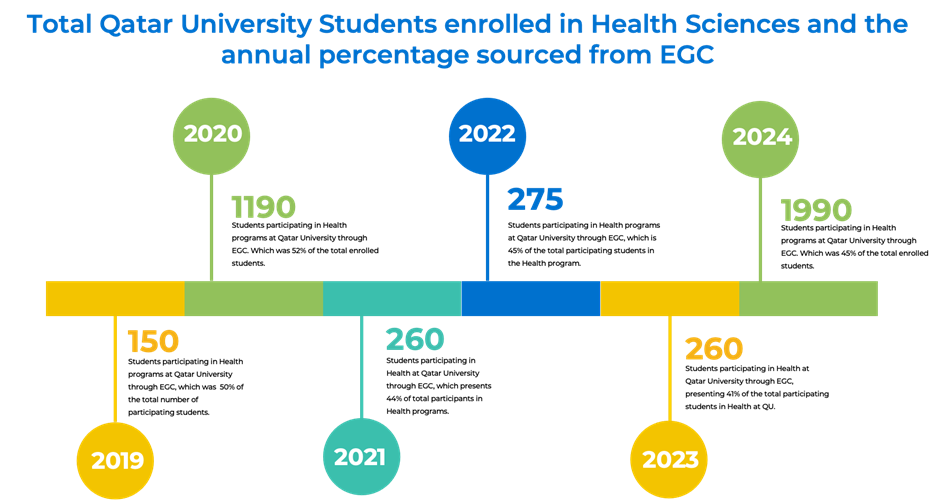 With the collaboration of QPHI and Qatar University, the Genomics and Precision Medicine program – part of the university’s Science and Research qualifications – aims to enhance student participation in Life Sciences. Aligned with Qatar’s 2030 vision, and the goal of EGC, the program seeks to increase exposure and education in life sciences, fostering scientific innovation and ultimately improving healthcare, innovation, education, and careers in Qatar.